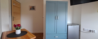 Przejdź do stronyJednoosobowy pokój na piętrze, z okien z którego rozlega się widok na ogród i Zielona Wzgórza nad Soliną