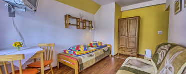 Przejdź do stronyTrzyosobowy pokój w poddaszu z balkonem, z którego rozlega się widok na Zielone Wzgórza nad Soliną i Wysokie Bieszczady